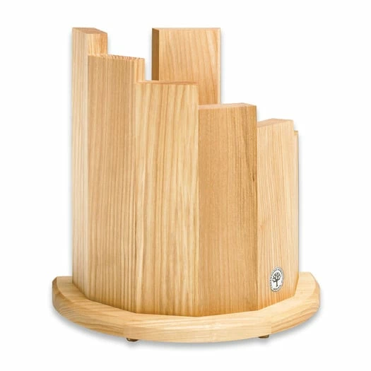 The Boker Knife Block Circle consists of seven solid wood segments, each of which contains strong magnets. The arrangement of six segments in a semicircle and one segment in the middle, all securely mounted on a solid wood base plate, enables the safe storage of seven high-quality kitchen knives of all standard sizes in a small space. A time-consuming and nerve-wracking search for the right blade is no longer necessary. The knife block made of stained ash wood is extremely practical to handle, easy to clean and gives high-quality kitchen knives an appropriate home. A real eye-catcher in every kitchen, completely manufactured in Europe. Solid ash wood with black finish.