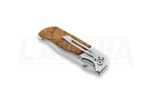 Even the most challenging tasks can easily be carried out with this sturdy and imposing knife. The finely blasted 440 clip point blade is protected against unintentional folding by the linerlock mechanism. The stainless steel bolsters and the generous root wood scales make the knife a true piece of jewellery. Thanks to the included pocket clip (attached by three screws), the knife is always ready to hand for its next use.