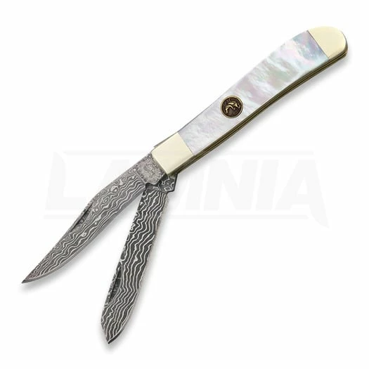 3 1/2″ closed. Damascus steel clip and spey blades. Genuine mother of pearl handles with nickel silver bolsters and inlay shield.