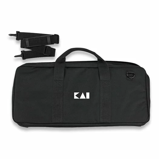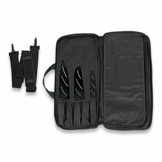 Space for up to 20 knives with secure elasticized pockets. PVC laminated 600D woven polyester with heavy duty nylon straps. Fully zippered with Velcro closures and padded reinforced handle. D-rings on each side for shoulder strap. Rigid supports inside the case resist crushing and ensure your knives are well protected.