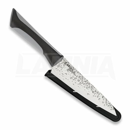 Luna Utility. 11.25″ overall. 6″ hammered finish high carbon stainless blade. Black and gray rubberized synthetic handle. Hand washing and drying are recommended. Do not cut frozen food with these knives. Do not use scouring pads, steel, or gritty cleaners. Black synthetic sheath.