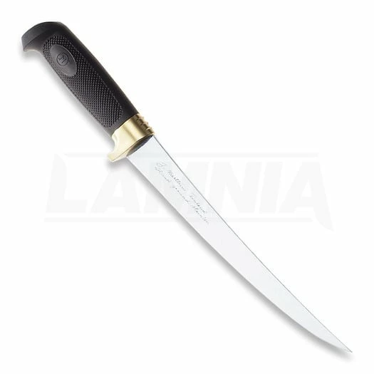 The flexible and extremely sharp stainless steel blade ensures clean-cut fillets. This is a knife for filleting the biggest of fish. The filleting knife is supplied with a black leather sheath.