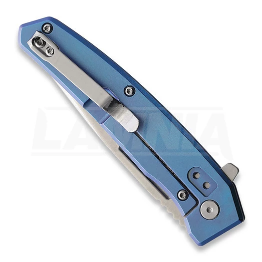 4.25″ (10.8cm) closed. 3.25″ (8.26cm) satin finish AUS-8 stainless tanto blade. Blue anodized titanium handle. Extended tang. Pocket clip.