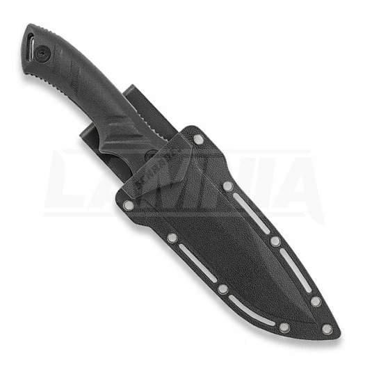 Overall: 9.875″; Blade: 4.5″ l 8Cr13MoV Stainless l Partially Serrated Edge l Titanium Finish; Handle: Black l Thermoplastic; Other Info: Full Tang l Lanyard Hole l Thumb Ridge. Drop point blade. Black molded TPE belt sheath.