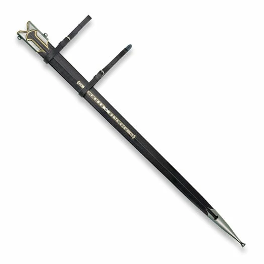 Designed to fit Anduril (UC1380), Anduril Limited edition, and Narsil swords (all sold separately). Genuine leather wrap and straps. Solid metal collar, fittings, plate, and tip. Antiqued metal and 24k gold plated finishes.